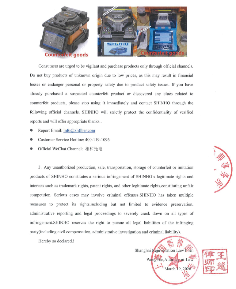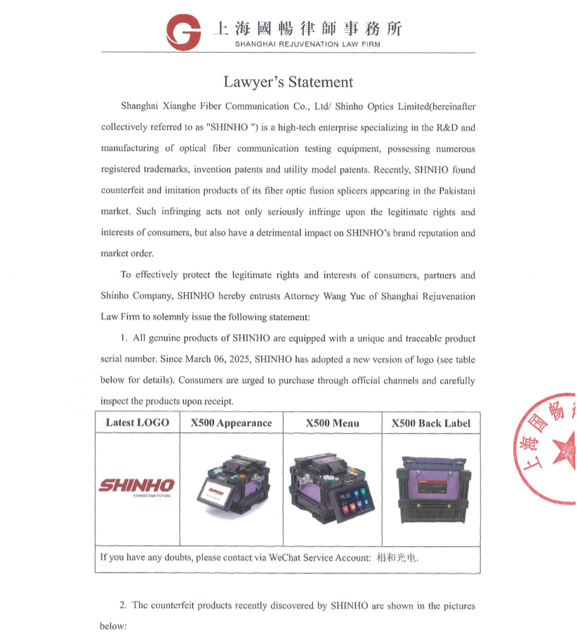 بيان محامٍ بشأن جهاز لحام الألياف الضوئية المزيف SHINHO X-500 في السوق الباكستانية.